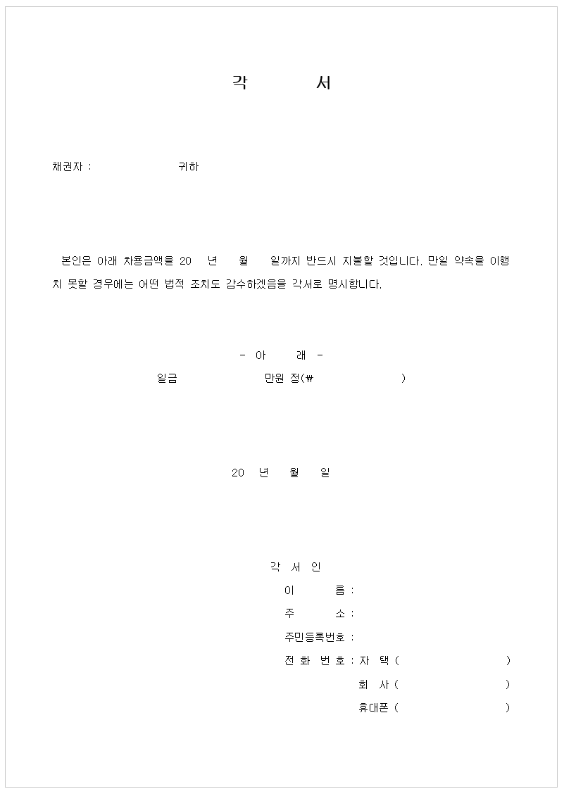 지불 이행 각서 작성을 도와주는 무료 양식을 우선 공유드립니다. 필요하신 분들은 바로 다운로드 받아 사용하실 수 있습니다.