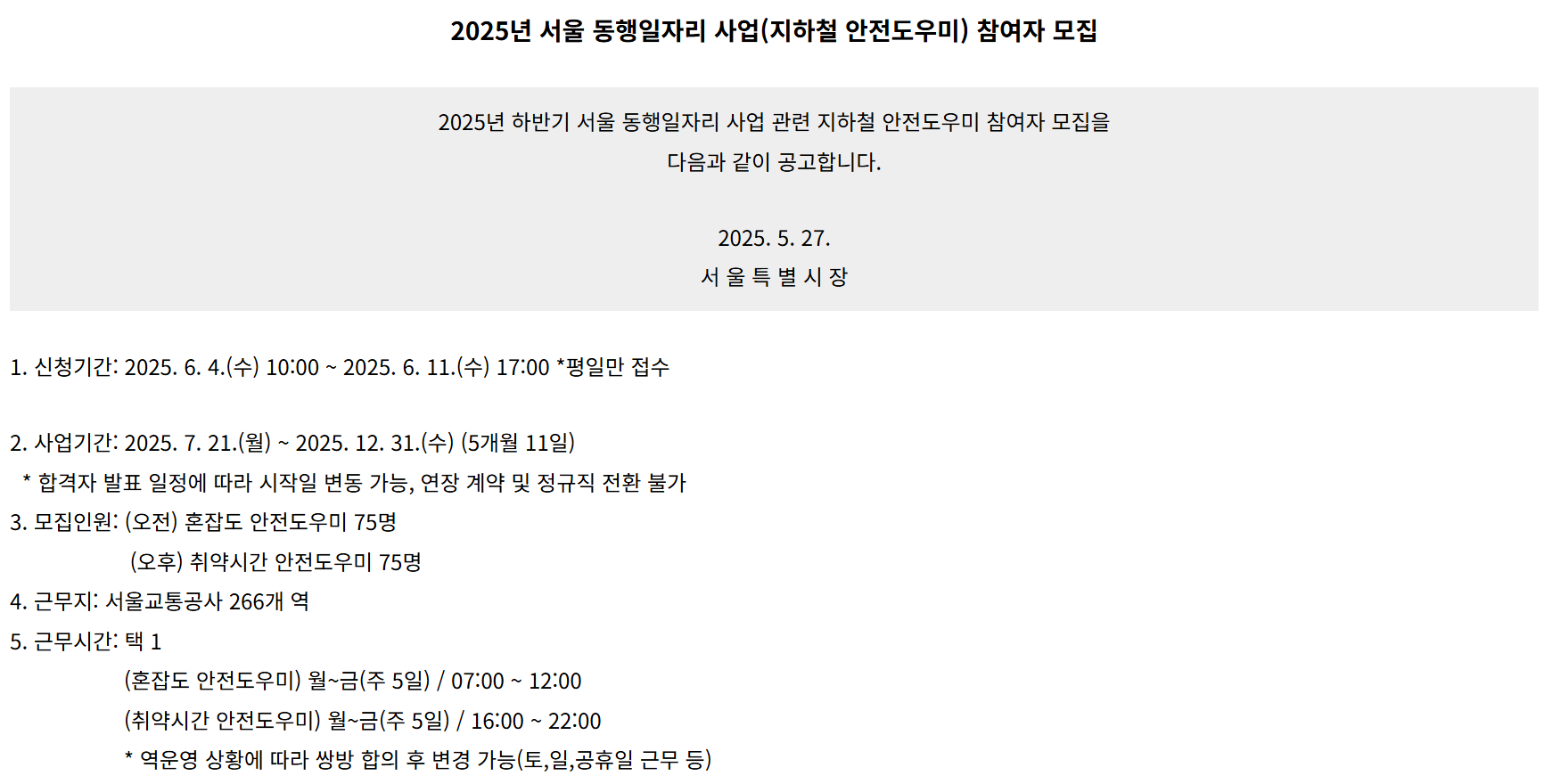 지하철 안전도우미 2025년 하반기 선착순 모집 시작!