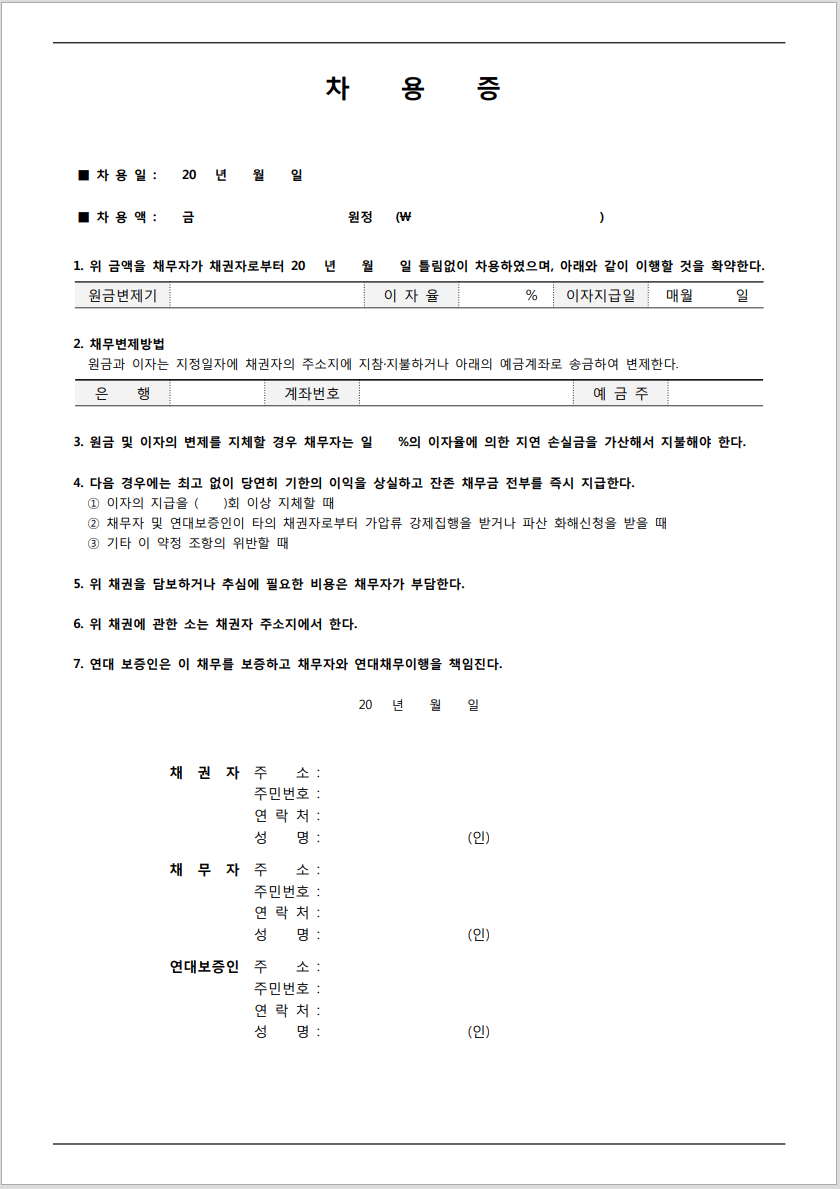 아래는 상황 별로 사용할 수 있는 차용증 양식을 공유드립니다. 각 상황에 맞는 파일을 다운 받아 사용하시면 되겠습니다.