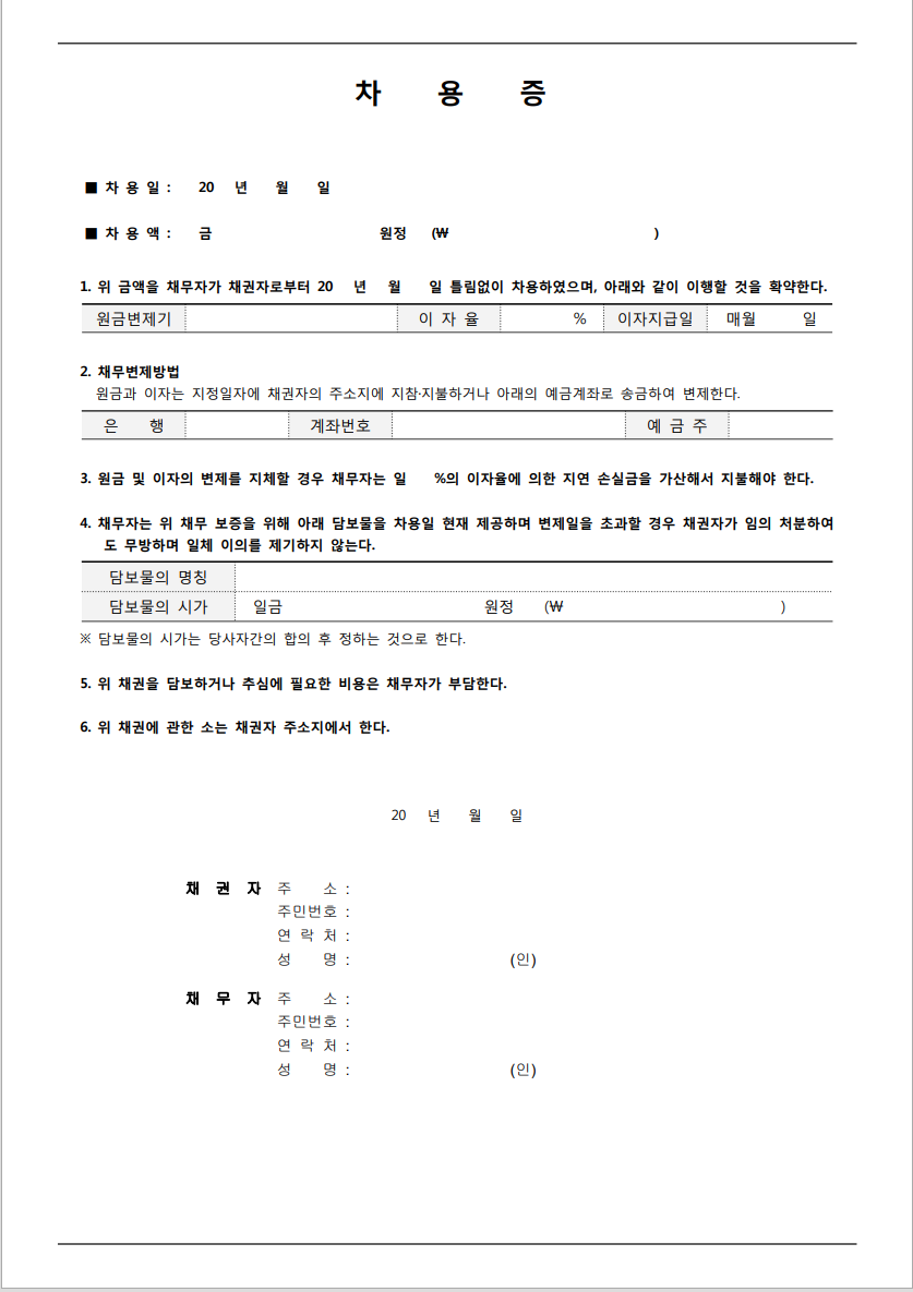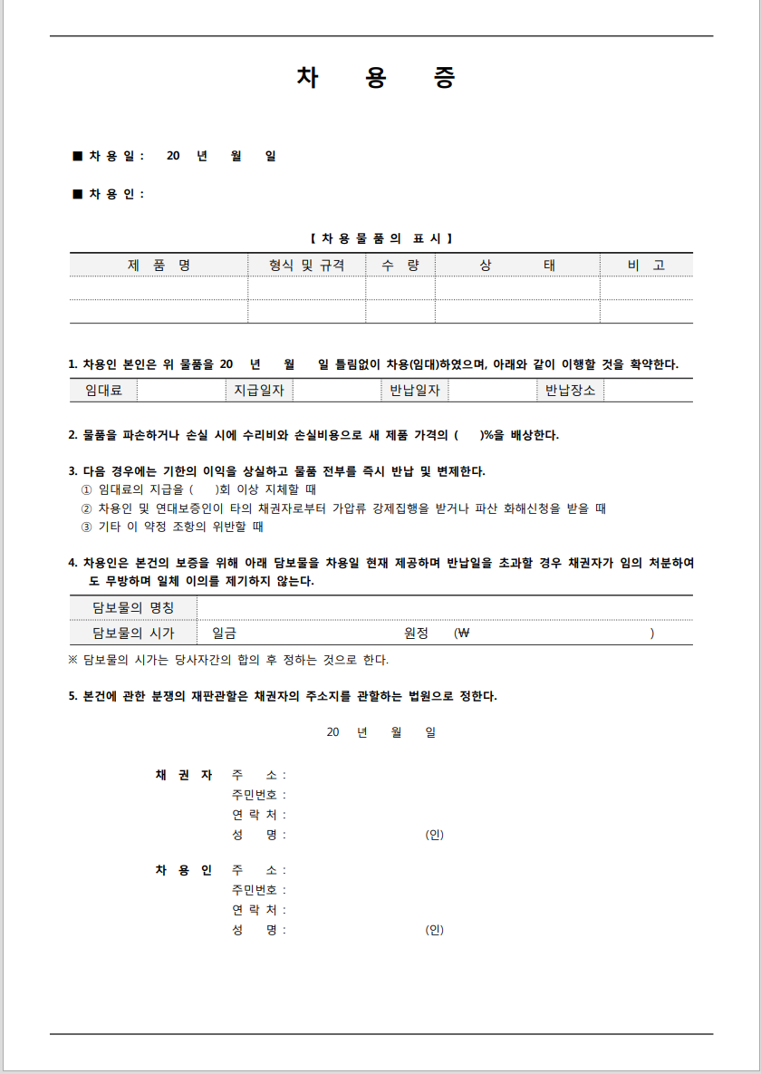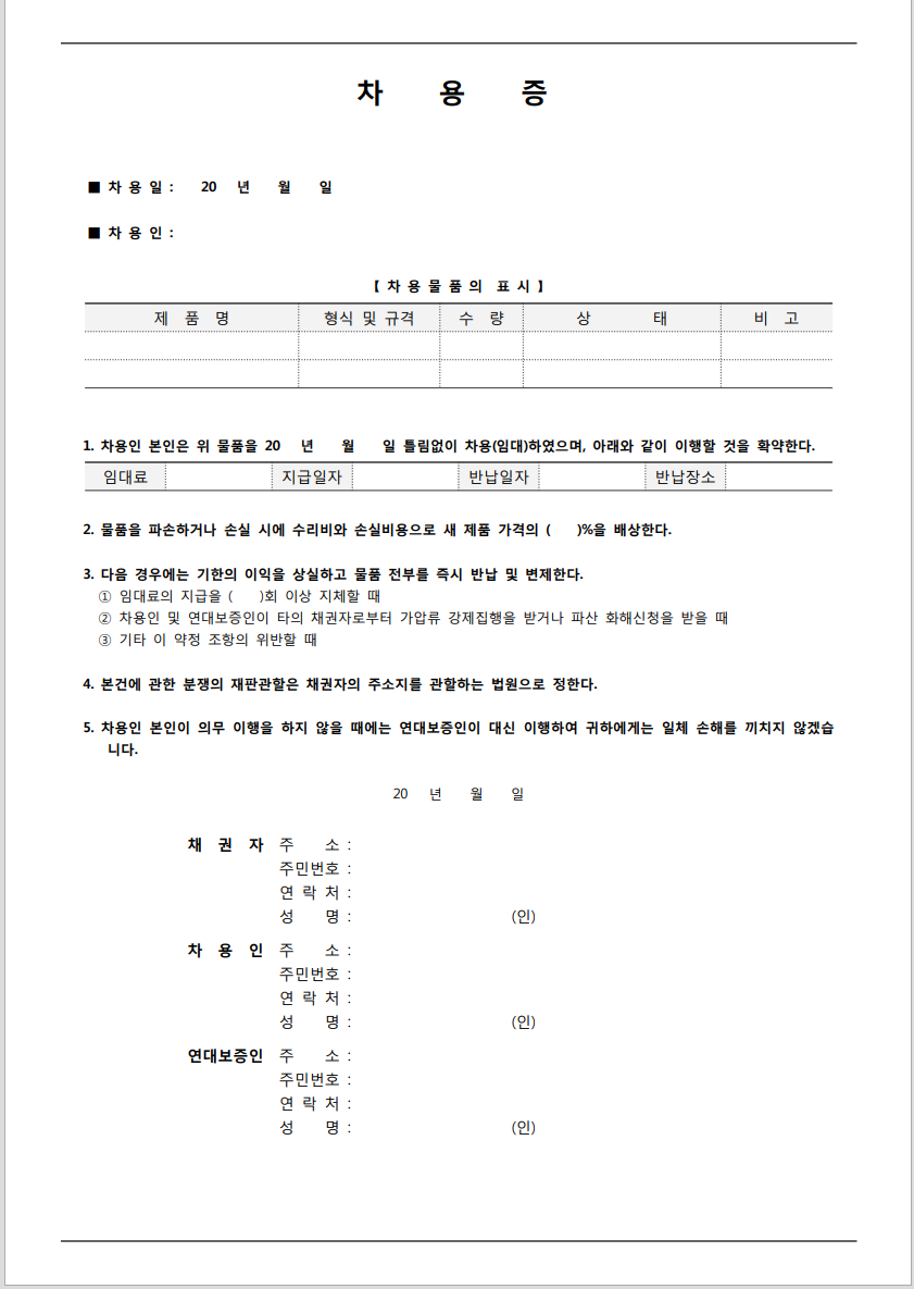 아래는 상황 별로 사용할 수 있는 차용증 양식을 공유드립니다. 각 상황에 맞는 파일을 다운 받아 사용하시면 되겠습니다.
