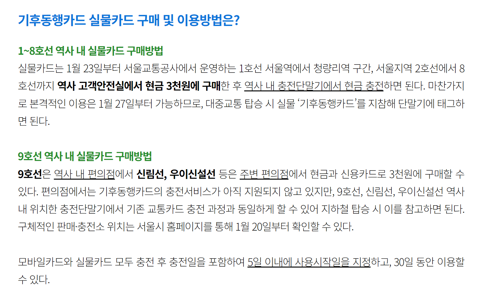 카드 충전시 충전일로부터 5일 이내 사용개시일 선택 가능합니다.(1월 23일 충전 시 1월 27일부터 사용가능. 30일 후 자동만료.) 실물카드 판매처는 서울교통공사 1~8호선 고객안전실과 역사 인근 편의점에서 구매가능하다고 합니다.