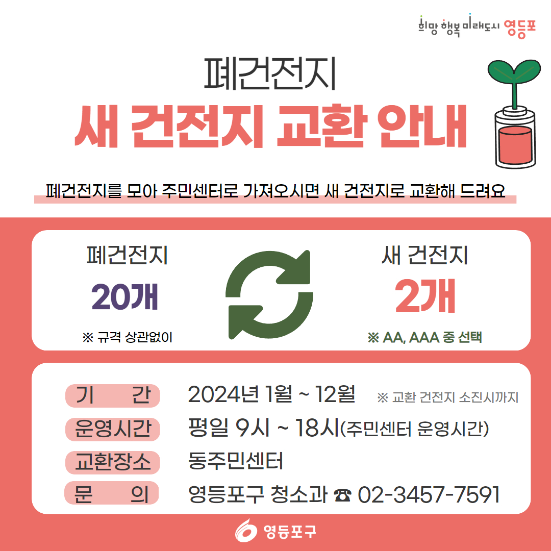 영등포구는 재활용 활성화와 환경오염 방지를 위해 폐건전지를 새 건전지로 교환해 주는 ‘폐자원 교환사업’을 실시합니다. 폐건전지에는 인체에 유해한 수은, 중금속 등이 함유되어 있어 일반 쓰레기로 버릴 경우 토양과 수질 오염을 일으킬 수 있지만, 아연이나 리튬 같은 희소 금속 자원도 회수할 수 있는 소중한 자원이기도 합니다.
