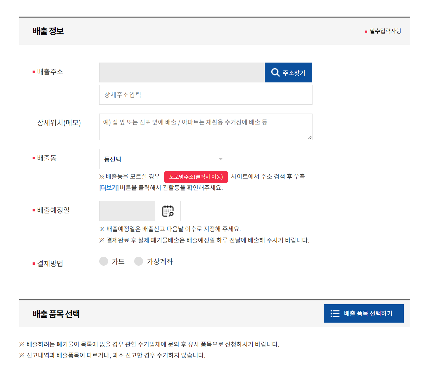 하남시청의 인터넷신고 페이지에 접속하시게 되면, 간단하게 배출자 정보, 배출장소, 배출품목 등을 입력하시고 품목에 맞는 수수료를 결제하시면 모든 과정은 쉽게 끝납니다.