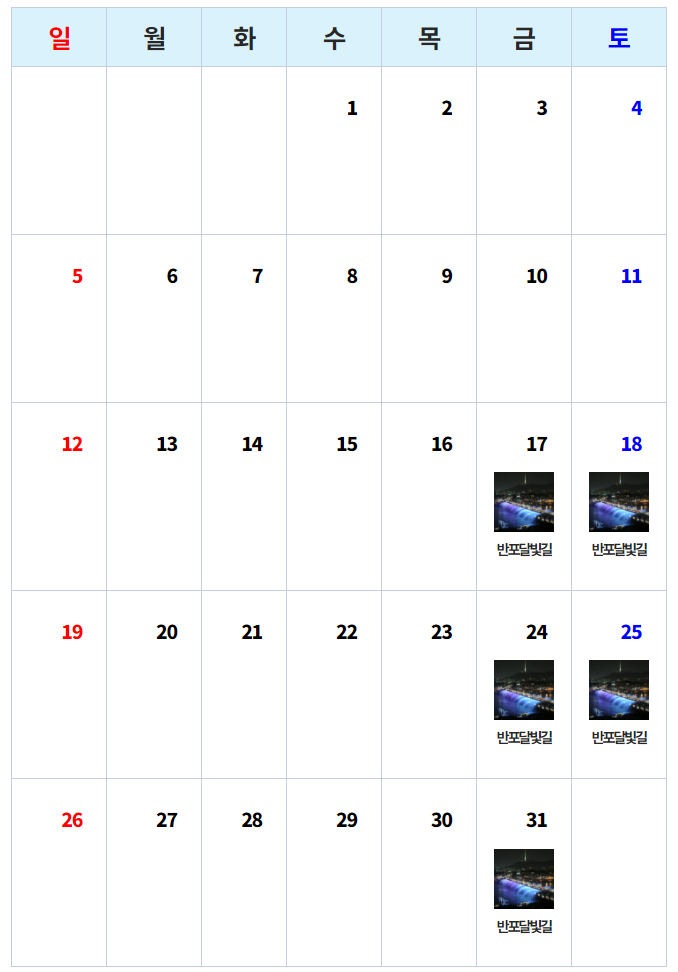 | 장소 | 반포한강공원 (봄 또는 상반기), 여의도한강공원 (가을 또는 하반기) |