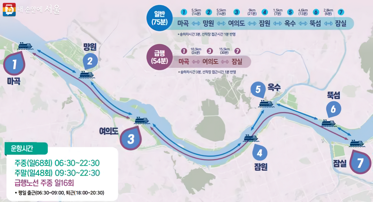 서울시는 한강을 따라 운행하는 리버버스를 통해 대중교통 서비스를 강화하고 있습니다. 리버버스는 한강에 위치한 7개 선착장을 이용해 승객들을 운송합니다. 출퇴근 시간에는 운항 간격을 15분으로 단축하고, 여의도에만 정차하는 급행노선도 운행합니다.