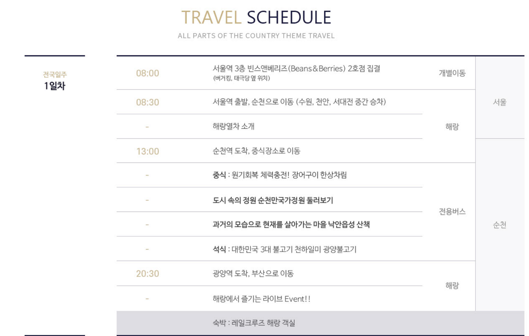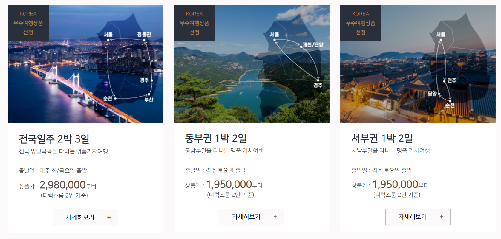 해랑열차의 코스는 전국일주(2박3일), 동부권(1박2일), 서부권(1박2일) 크게 3가지로 나뉘게 됩니다.