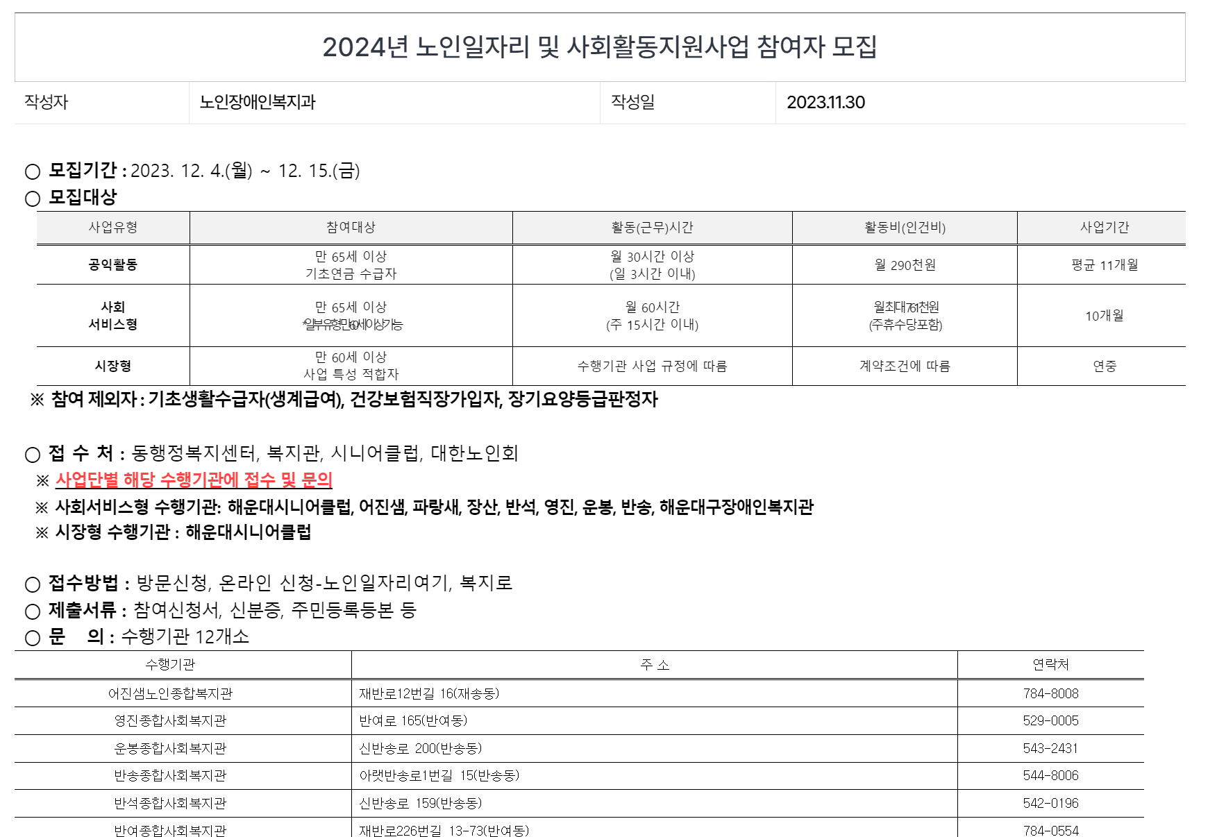 바로 지원가능한 해운대구 노인일자리 구인구직 일자리 정보만 모아봤습니다.