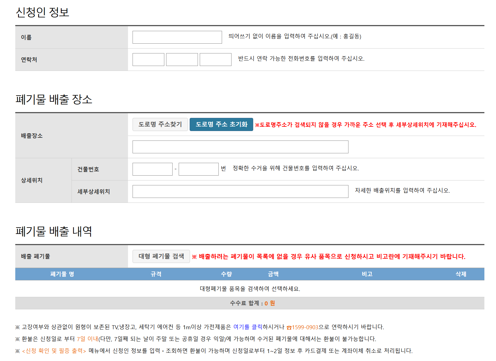 홍천군청의 인터넷신고 페이지에 접속하시게 되면, 간단하게 배출자 정보, 배출장소, 배출품목 등을 입력하시고 품목에 맞는 수수료를 결제하시면 모든 과정은 쉽게 끝납니다.