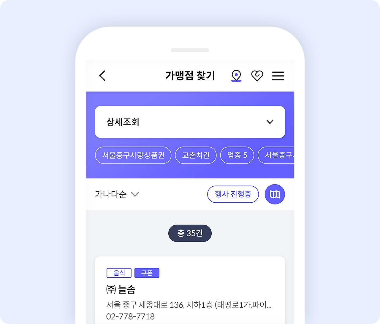 또는 내 주변 가맹점을 조회할 수도 있습니다. 조회 결과에는 가맹점의 위치, 전화번호 등 기본 정보뿐만 아니라 가맹점 이용에 관련된 정보도 함께 제공됩니다. 서울사랑상품권을 이용하고자 하는 경우, 해당 가맹점의 약관을 확인하고 판매대행점의 승인을 받아야 합니다.