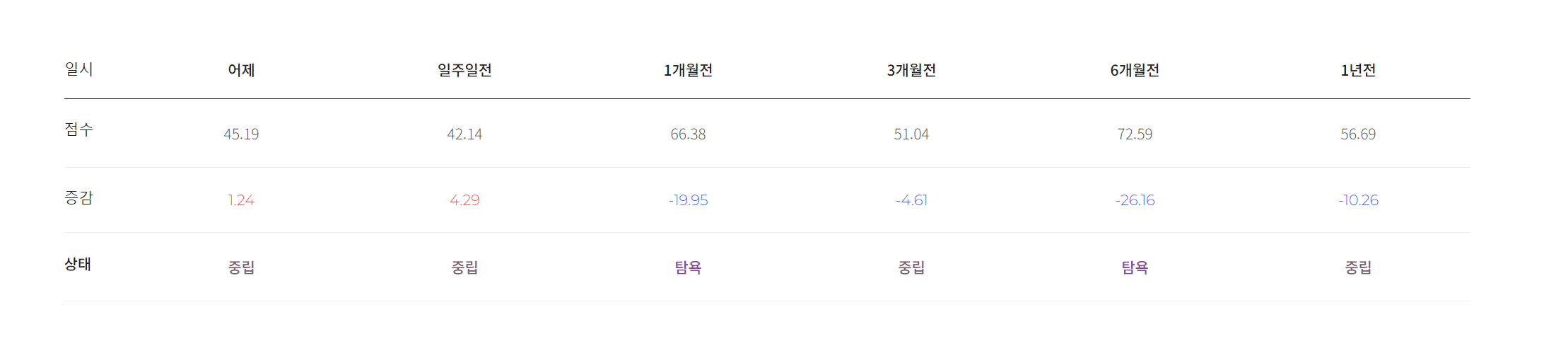 0 | 매우공포 | 변동성이 크고 높은 거래량을 동반한 하락을 의미합니다. 패닉셀링이 이어지고 있습니다. |