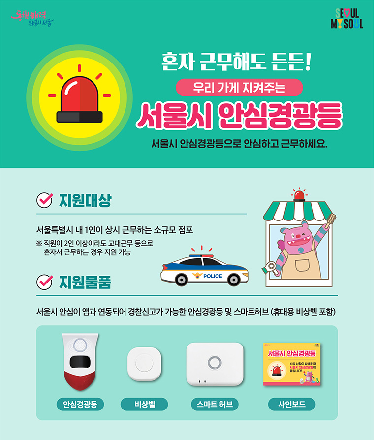 영등포구 안심경광등으로 1인 점포의 안전을 지키세요! 서울시가 나홀로 사장님을 위해 안심경광등 지원을 확대합니다. 비상벨, 사이렌, 안심이앱 연동으로 긴급 상황에 신속 대응! 2025년 5월 27일부터 선착순 신청하세요!