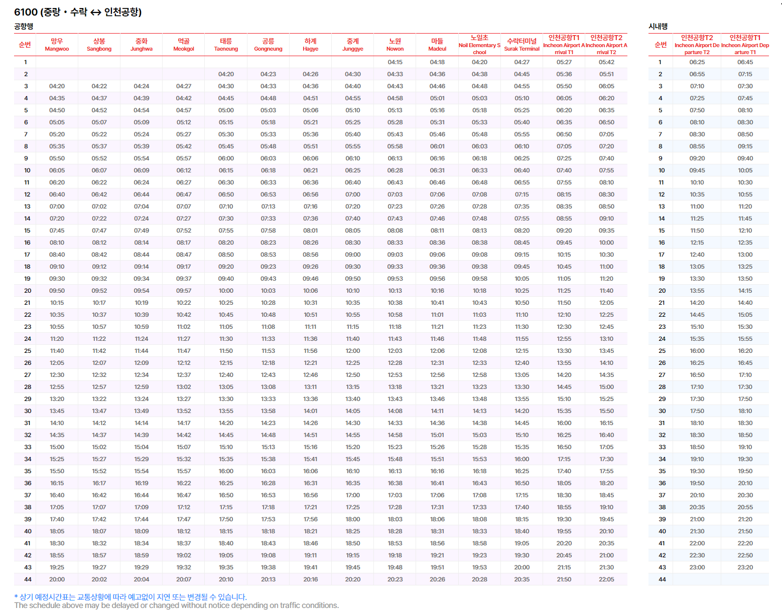 6100번 공항버스의 시간표는 아래 이미지를 참고해서 확인해주시면 됩니다.