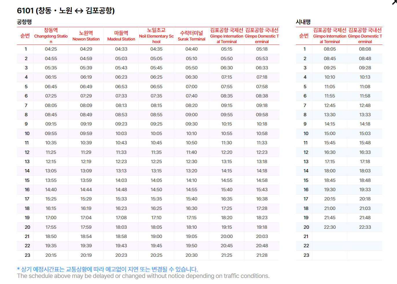 6101번 공항버스의 시간표는 아래 이미지를 참고해서 확인해주시면 됩니다.