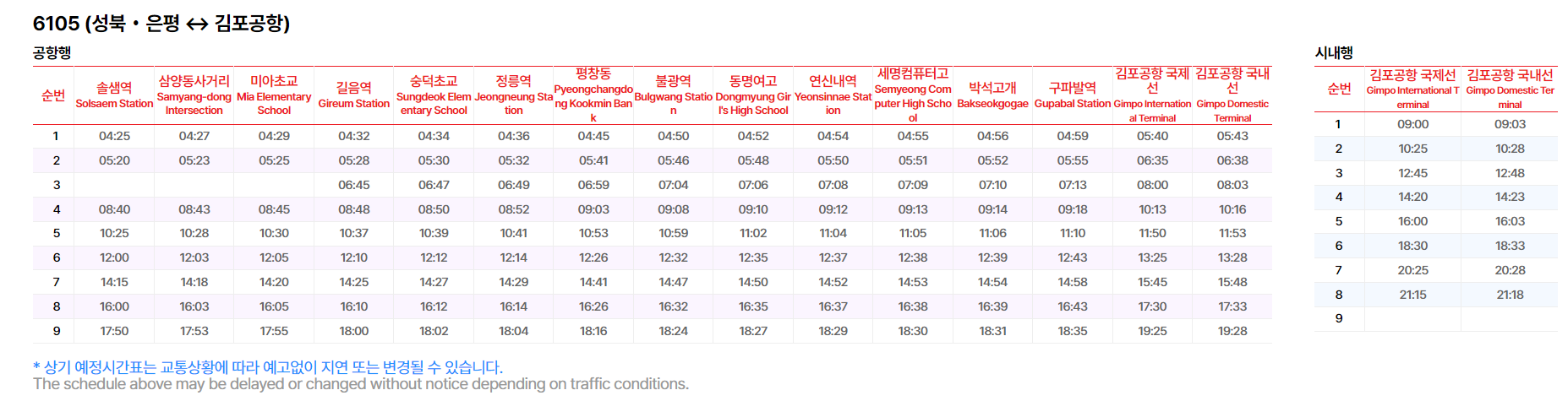 6105번 공항버스의 시간표는 아래 이미지를 참고해서 확인해주시면 됩니다.